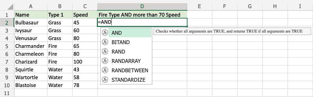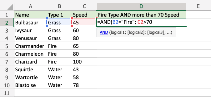 Now each row has a check for both being Fire type and Speed greater than 70: