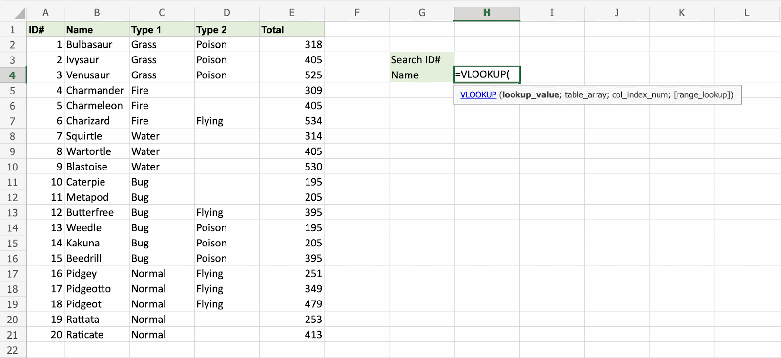 Use the VLOOKUP function to find the Pokemon names based on their ID#: